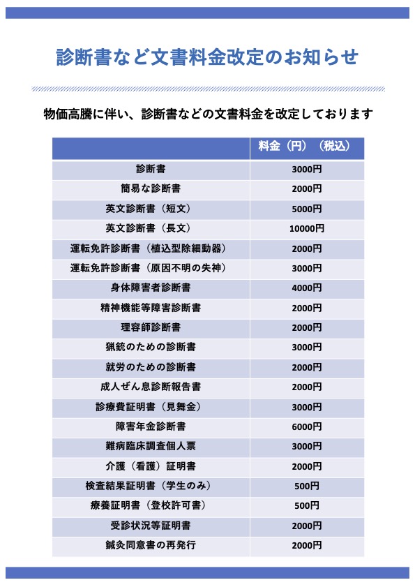 26年4月1日より、昨今の物価高騰に伴い診断書などの文書料金を改定を致します